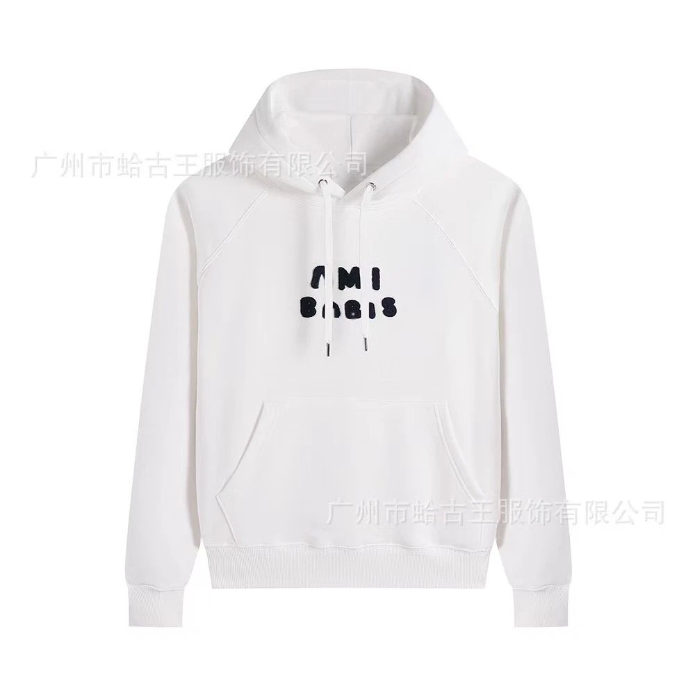 This minimalist white hoodie features the iconic 'AMI PARIS' logo printed in bold black letters across the chest, embodying the brand’s signature blen...