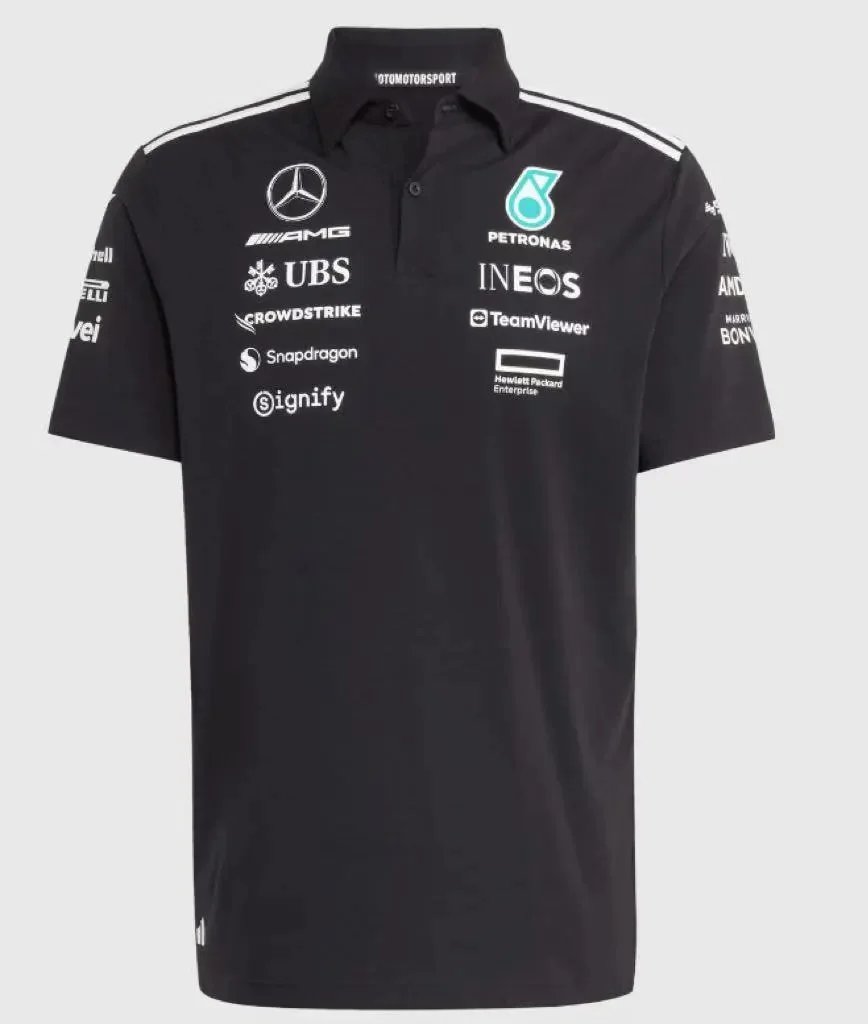 This official Mercedes-AMG Petronas F1 Team polo shirt is a high-performance fan apparel piece, crafted in sleek black technical fabric with crisp whi...