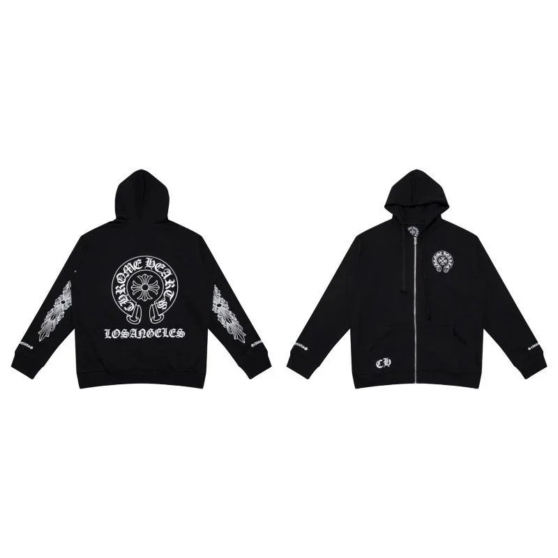 This premium black zip-up hoodie from Chrome Hearts features the brand's iconic gothic aesthetic with bold white embroidery. The back showcases a larg...