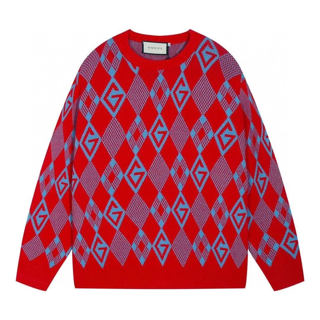 This Gucci sweater showcases the brand’s signature bold aesthetic through a vibrant red knit base adorned with an intricate argyle pattern in light bl...