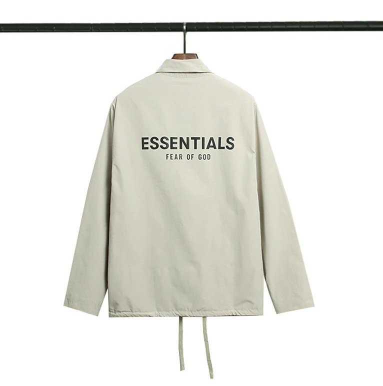 This Fear of God Essentials coach jacket features a minimalist, utilitarian design with a clean beige canvas-like fabric and a relaxed, oversized silh...