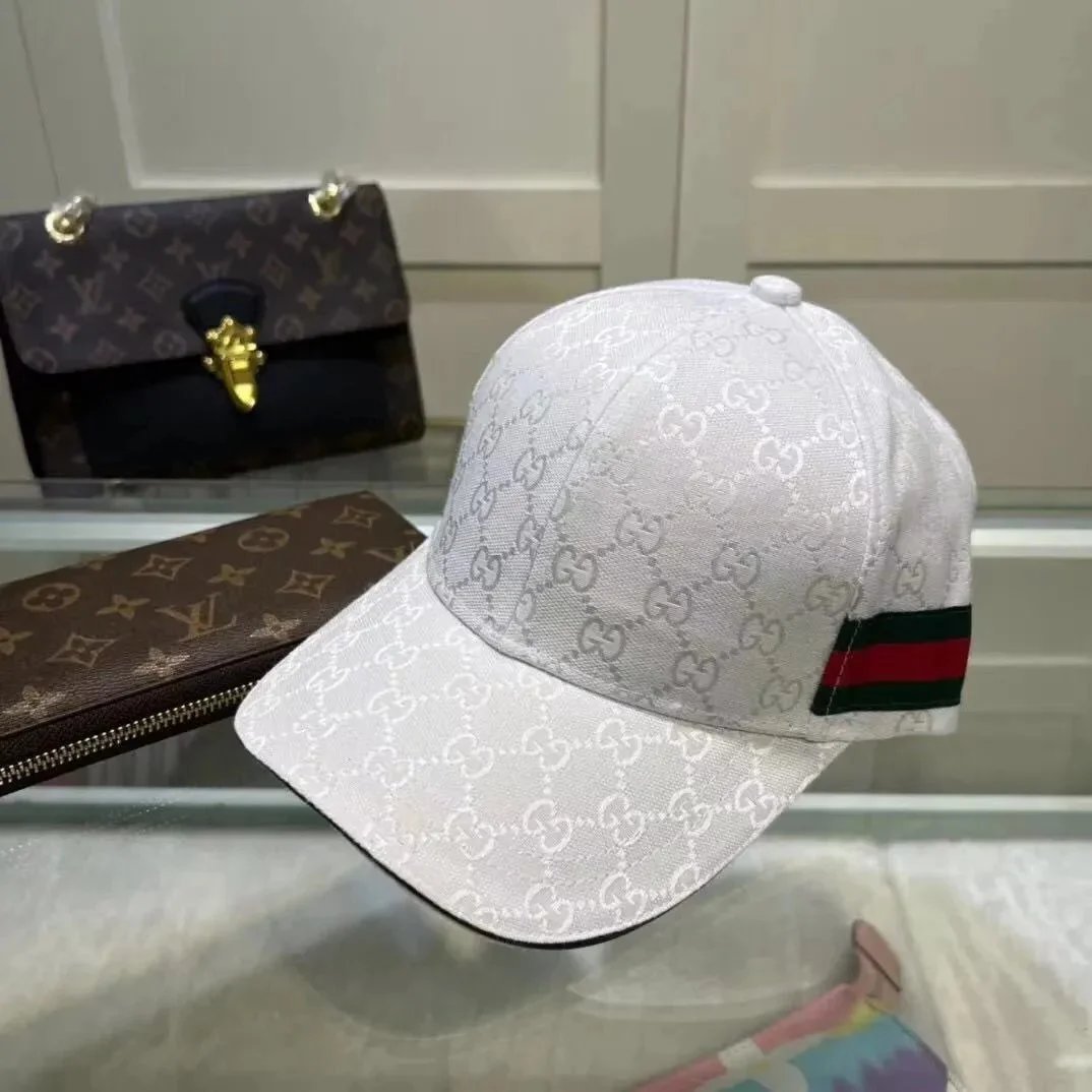This Gucci baseball cap features the iconic interlocking GG monogram pattern woven throughout its lightweight fabric in a subtle tonal white-on-white ...