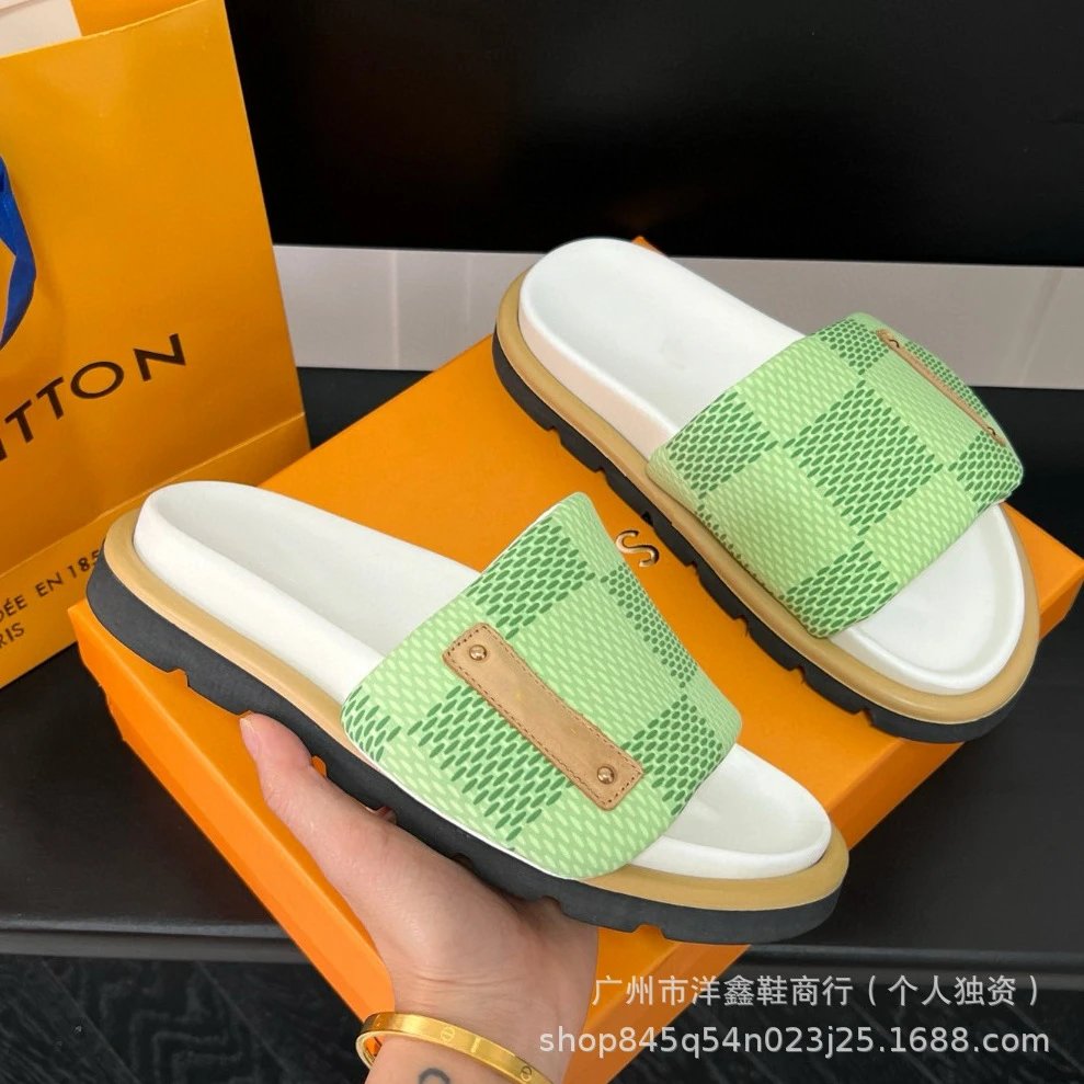 These Louis Vuitton slide sandals feature the iconic Damier Azur canvas in a fresh mint-green and white checkerboard pattern, offering a modern twist ...