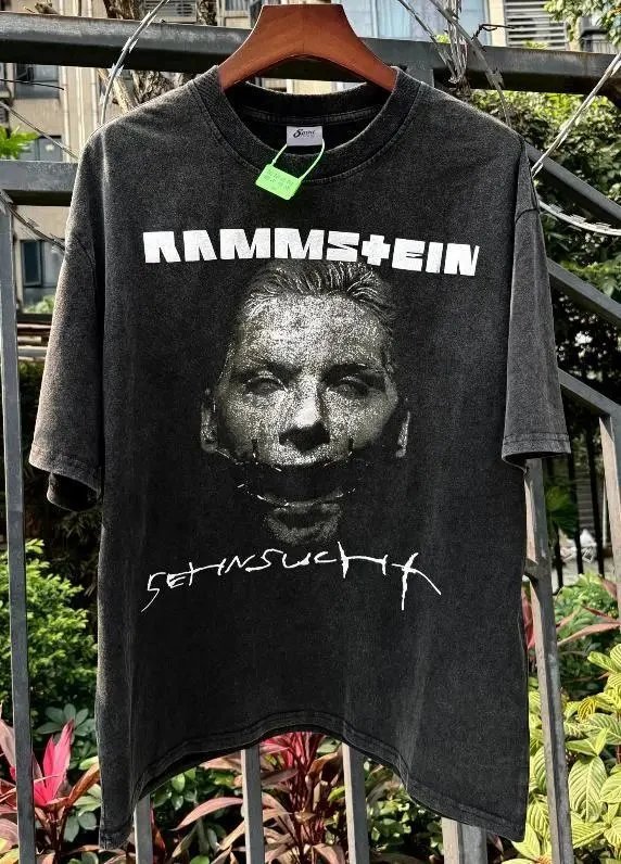 This distressed black cotton T-shirt features a bold, high-contrast graphic print of Rammstein’s iconic 'Sehnsucht' album artwork: a grainy, monochrom...