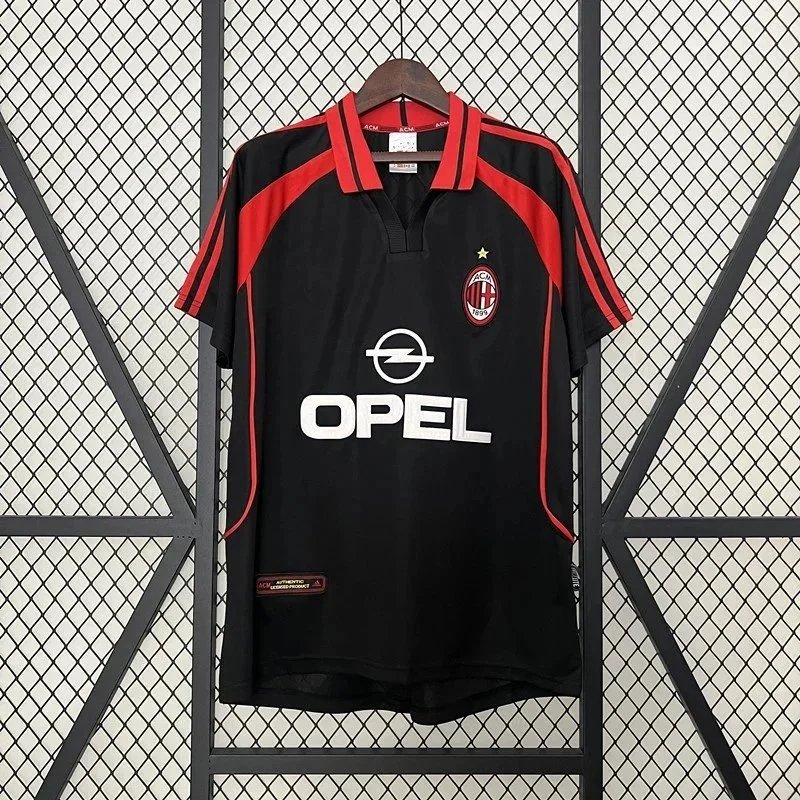Authentic AC Milan third kit from the 1998–99 Serie A season, manufactured by Adidas. This iconic black jersey features bold red accents on the collar...