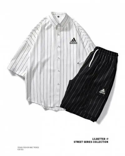 This coordinated streetwear set features a relaxed-fit button-up shirt and matching drawstring shorts in classic pinstripe design. The white shirt wit...