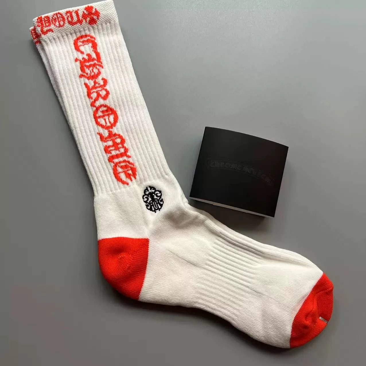 Premium cotton-blend crew socks featuring Chrome Hearts' iconic gothic script logo in bold red vertically knitted along the calf, complemented by a bl...