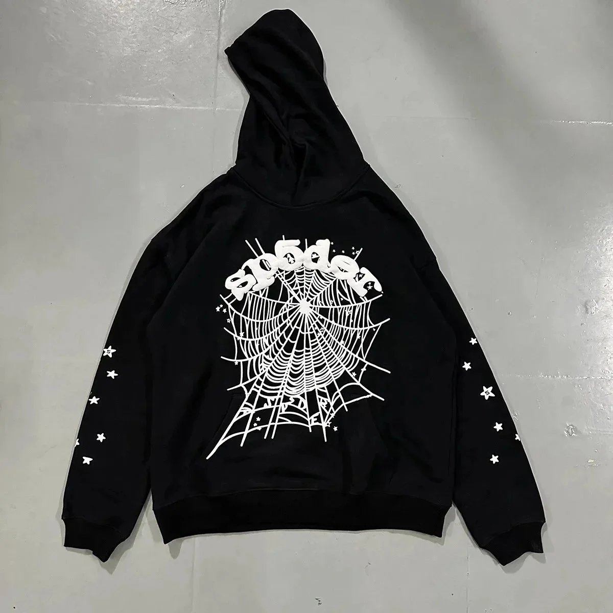 This black oversized hoodie features a bold white spiderweb graphic centered on the chest, overlaid with stylized 'SPIDER' lettering in a graffiti-ins...