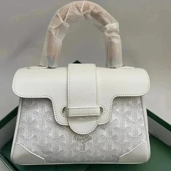 This elegant Goyard Saint Louis PM handbag showcases the brand’s signature chevron-patterned Goyardine canvas in crisp white, complemented by smooth w...