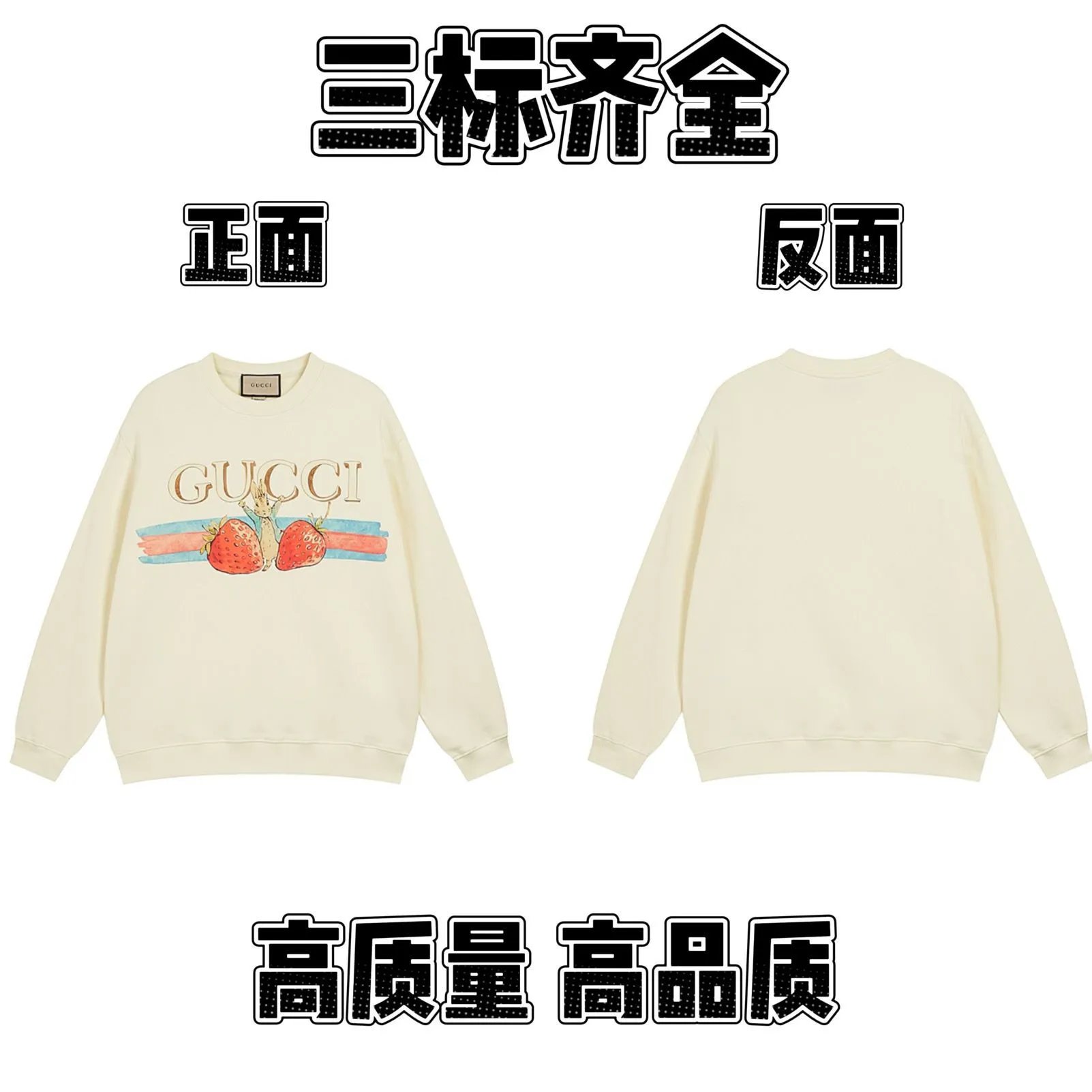 This Gucci crewneck sweatshirt features a distinctive whimsical print with the iconic 'GUCCI' logo in gold-tone lettering, flanked by two vibrant stra...