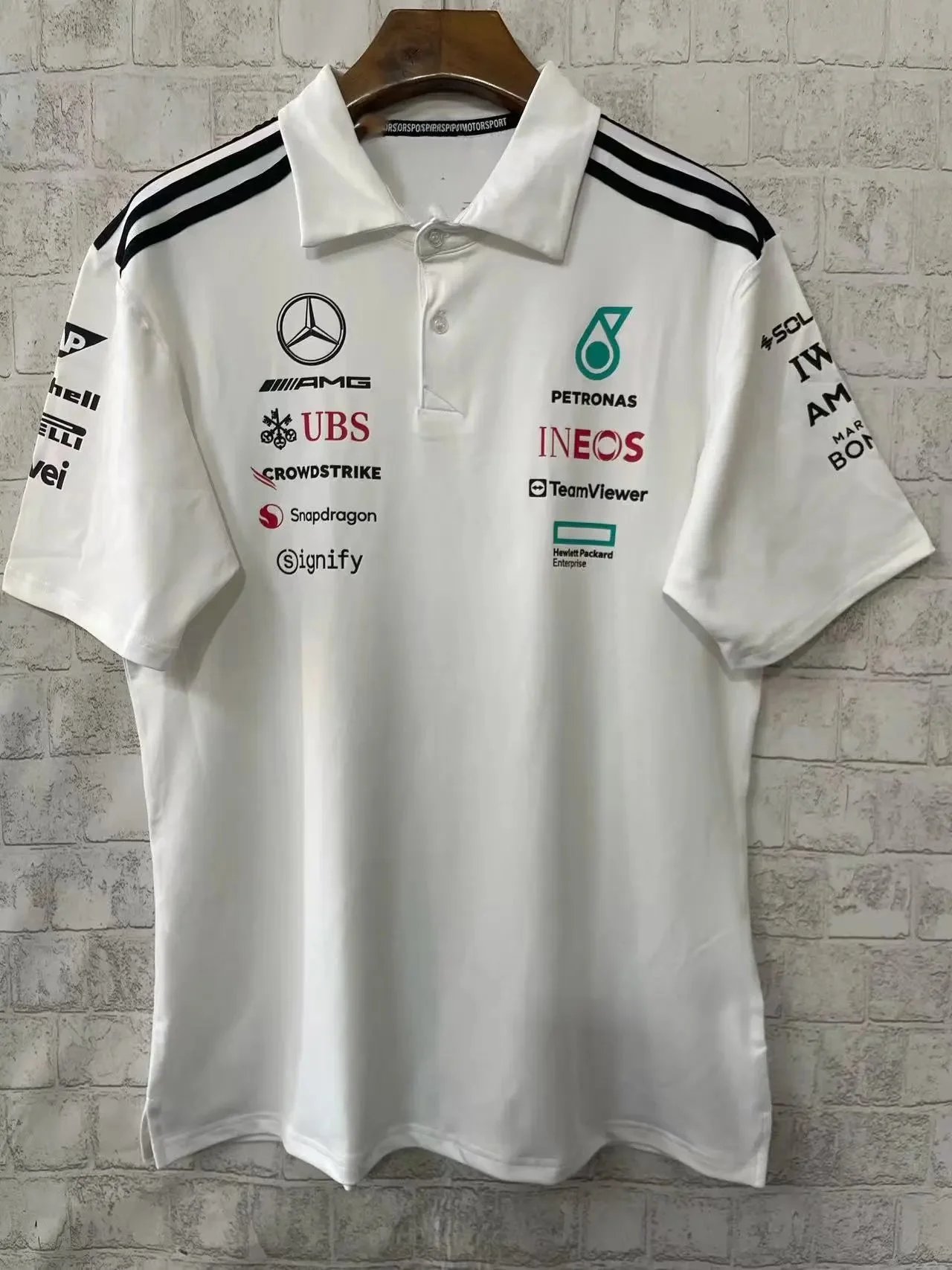 This authentic Mercedes-AMG Petronas Formula 1 Team polo shirt is a high-performance fan apparel piece, crafted in crisp white technical piqué fabric ...