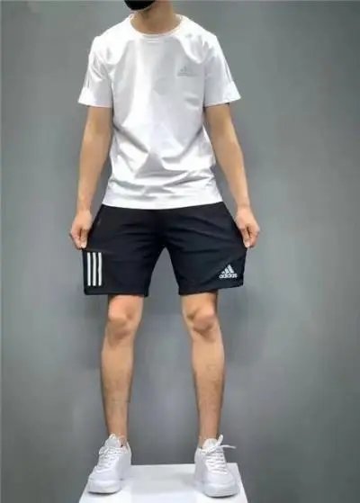 This sporty streetwear ensemble features Adidas Originals' iconic black performance shorts with signature white three-stripe detailing on the left thigh and a small white trefoil logo on the right hem—classic branding that signals authenticity and heritage. Paired with a clean, minimalist white crew-neck t-shirt (bearing a subtle embroidered Adidas logo on the chest) and crisp white low-top sneakers (likely Adidas Cloudfoam or similar lifestyle model), the outfit delivers versatile athleisure appeal. The shorts are crafted from lightweight, breathable synthetic fabric with an elastic waistband and drawcord for adjustable fit, ideal for warm-weather activities or casual urban wear. The monochrome palette enhances versatility, while the three-stripe motif adds instant brand recognition and retro-sport charm. Perfect for gym sessions, weekend errands, or layered under oversized outerwear in transitional seasons. Designed for comfort and mobility, the cut sits mid-thigh with slight tapering, balancing modern silhouette with functional sport design. Ideal for men seeking understated yet branded activewear that transitions seamlessly from workout to street.