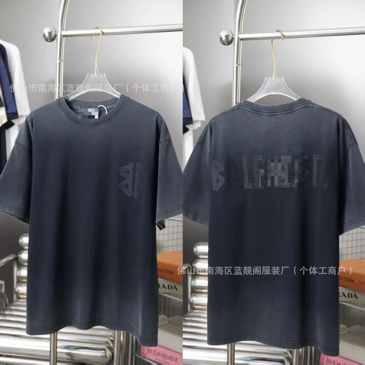 This oversized crewneck t-shirt features a premium washed charcoal gray cotton jersey with subtle garment-dye distressing for a lived-in, luxury streetwear aesthetic. The front displays a tonal 'BB' monogram logo in a pixelated, textured print, while the back showcases the full 'BALENCIAGA' brand name in a matching low-contrast digital-style typography—both rendered in slightly darker gray for understated branding. Constructed with relaxed drop shoulders, a boxy silhouette, and reinforced ribbed neckline, it offers comfort and modern volume. Ideal for layering or standalone wear, this piece embodies Balenciaga’s signature deconstructed minimalism. Perfect for urban casual styling, art events, or high-fashion street looks in spring/summer/fall. The soft, pre-washed fabric ensures breathability and reduced shrinkage, enhancing daily wearability without sacrificing designer edge.