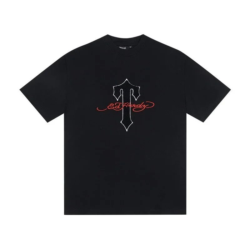 This premium black cotton t-shirt features Ed Hardy's iconic embroidered logo at center chest: a stylized gothic 'T' in white outline with the signature 'Ed Hardy' script in vibrant red cursive beneath it. The embroidery adds texture and dimension, elevating the classic streetwear silhouette. Made from soft, breathable 100% cotton jersey with a relaxed fit, ribbed crew neckline, and clean hem—ideal for layering or wearing solo. The bold contrast of white and red against black ensures high visual impact while maintaining timeless appeal. Designed for urban fashion enthusiasts who appreciate tattoo-inspired Americana aesthetics, this tee pairs effortlessly with denim, cargo pants, or joggers. Perfect for casual outings, concerts, or everyday wear in spring through fall. The garment is finished with a discreet brand tag at the inner collar, reinforcing authenticity without compromising minimalism.