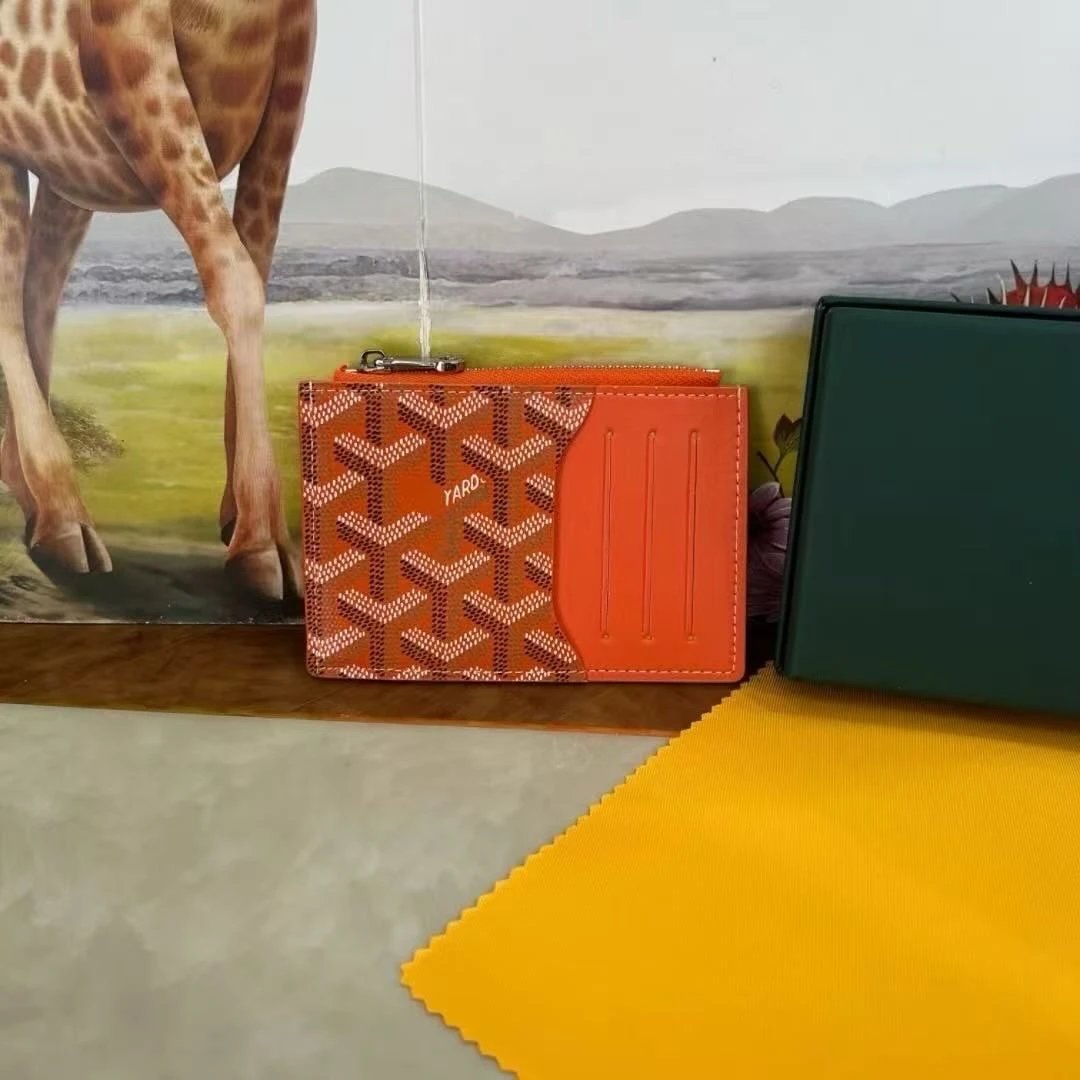 This Goyard Saint Sulpice card holder showcases the brand’s iconic chevron-patterned Goyardine canvas in vibrant orange, paired with smooth calfskin leather trim. The compact rectangular design features a secure top zipper closure with a polished metal pull tab, and an external vertical card slot panel embossed with fine parallel lines for easy access. The interior includes multiple card slots and a small zippered coin compartment, ideal for minimalist daily carry. The 'YARD' signature is subtly debossed on the front canvas—part of Goyard’s discreet branding tradition. Crafted in France with meticulous hand-stitching, it balances heritage craftsmanship with modern functionality. Perfect for urban professionals or fashion-conscious individuals seeking understated luxury. Its slim profile fits effortlessly in pockets or larger bags, making it suitable for business meetings, travel, or casual outings. The orange hue adds a bold yet elegant pop against neutral outfits, aligning with contemporary streetwear and smart-casual aesthetics.
