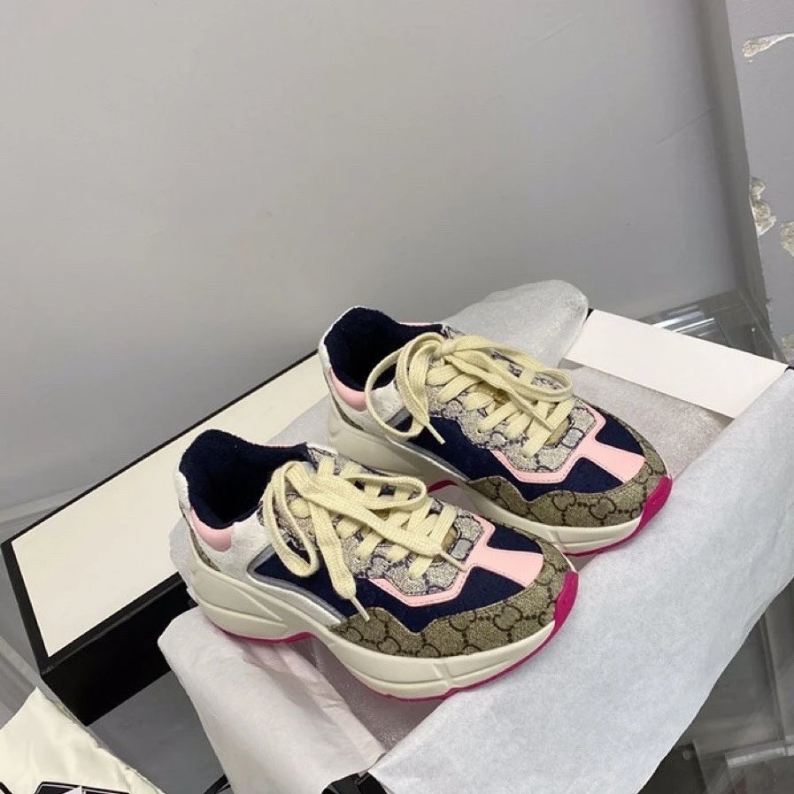 The Gucci Rhyton sneakers showcase the brand’s bold fusion of heritage and modern streetwear aesthetics. Featuring the iconic GG Supreme monogram canvas in beige/brown interlocking G pattern, contrasted with navy blue suede panels and vibrant pink accents on the toe cap, heel counter, and midsole edge. The chunky white rubber sole with pink outsole adds height and contemporary silhouette, while cream-colored laces and padded navy collar ensure comfort. The design includes signature Gucci detailing: embroidered GG motif on the side panel and tonal leather overlays. Crafted with a mix of premium materials—supreme canvas, suede, and rubber—the shoes offer lightweight support and stylish versatility. Ideal for fashion-forward daily wear, pairing effortlessly with jeans, tailored trousers, or athleisure sets. Perfect for spring and fall seasons, these sneakers embody luxury sportswear with runway-ready edge. Their oversized profile and color-blocking make them a standout statement piece in any urban wardrobe.