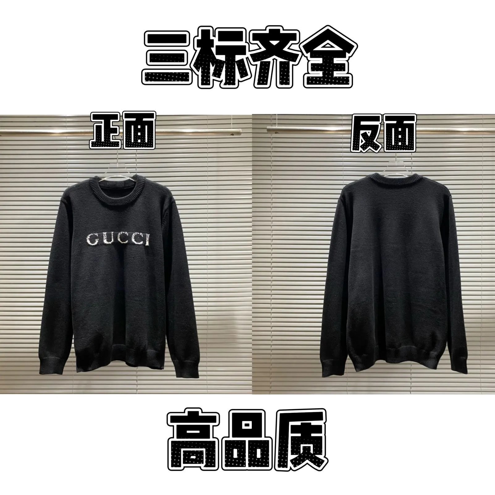 This high-quality Gucci crewneck sweater features a classic relaxed fit with ribbed knit detailing at the neckline, cuffs, and hem for durability and comfort. The front showcases a prominent 'GUCCI' logo embroidered in shimmering silver-toned thread with subtle texture, creating a luxurious contrast against the deep black merino wool or wool-blend fabric. The reverse side is clean and minimalist—no branding—emphasizing versatility and refined elegance. Crafted with premium materials and precise stitching, it offers softness against the skin while maintaining structure. Ideal for layering in transitional seasons or as a statement piece in monochrome streetwear ensembles. Perfect for upscale casual occasions: gallery visits, dinner dates, or sophisticated urban outings. The garment’s balanced silhouette flatters various body types, and its timeless design ensures longevity beyond seasonal trends. Care instructions recommend dry cleaning or gentle hand wash to preserve embroidery integrity and fabric quality.