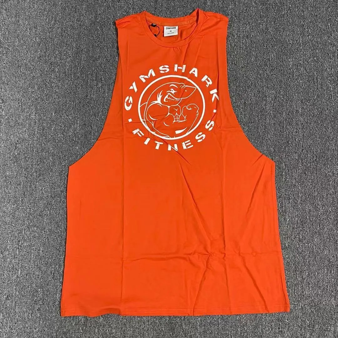 This vibrant orange sleeveless athletic vest-top from Gymshark features a bold white circular logo print on the chest, showcasing the brand’s iconic muscular shark mascot encircled by 'GYMSHARK FITNESS' text. Constructed from lightweight, breathable performance fabric with a relaxed yet fitted silhouette, it offers excellent moisture-wicking and stretch for unrestricted movement during workouts. The wide armholes and rounded hem enhance comfort and mobility, while the ribbed crew neckline ensures durability and a clean finish. Ideal for gym sessions, HIIT training, or casual streetwear styling, this top combines functional sportswear engineering with bold streetwear aesthetics. The high-contrast white-on-orange design delivers strong visual impact, making it a standout piece for fitness enthusiasts who value both performance and style. Perfect for warm-weather training or layering in transitional seasons, it pairs effortlessly with joggers, shorts, or leggings.