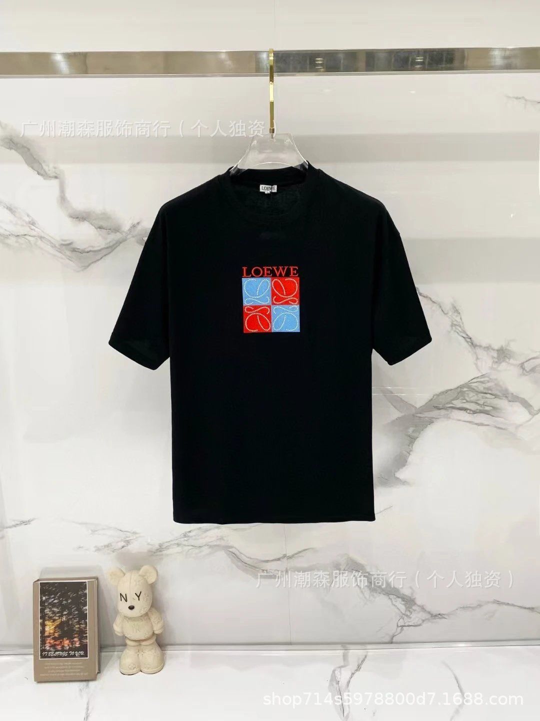 This premium black cotton jersey t-shirt features Loewe's iconic 'Puzzle' logo prominently embroidered on the chest—four interlocking squares in red and light blue, each containing a stylized 'L' motif, with 'LOEWE' in bold red uppercase lettering above. The embroidery uses raised threadwork with visible stitching details, adding texture and luxury to the minimalist silhouette. Cut in a relaxed, slightly oversized fit with a classic crew neck and short sleeves, it offers comfort and versatility. Crafted from soft, breathable 100% cotton, the tee maintains shape wash after wash while resisting pilling. Ideal for elevated streetwear styling, it pairs effortlessly with tailored trousers, denim, or layered under blazers. Perfect for spring and summer daily wear, art gallery visits, or casual social gatherings where refined design meets contemporary ease. The clean lines and signature branding make it a statement piece that balances heritage craftsmanship with modern minimalism.