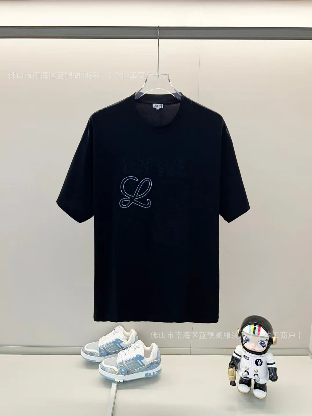 This premium black cotton jersey t-shirt features Loewe's iconic Anagram logo embroidered in contrasting white thread at the chest, creating a subtle yet distinctive statement. The relaxed-fit silhouette offers modern comfort with short sleeves and a classic crew neckline. A small woven 'LOEWE' label is visible at the inner collar, confirming authenticity. Crafted from soft, breathable fabric, it drapes elegantly for effortless layering or standalone wear. Ideal for streetwear-inspired looks, smart-casual outings, or elevated everyday styling—pairs perfectly with denim, tailored trousers, or shorts. The minimalist embroidery adds texture without bulk, maintaining a clean aesthetic while signaling luxury heritage. Designed for unisex appeal, its versatile cut suits diverse body types. Perfect for spring and summer seasons, this piece embodies Loewe’s fusion of craftsmanship and contemporary design ethos.