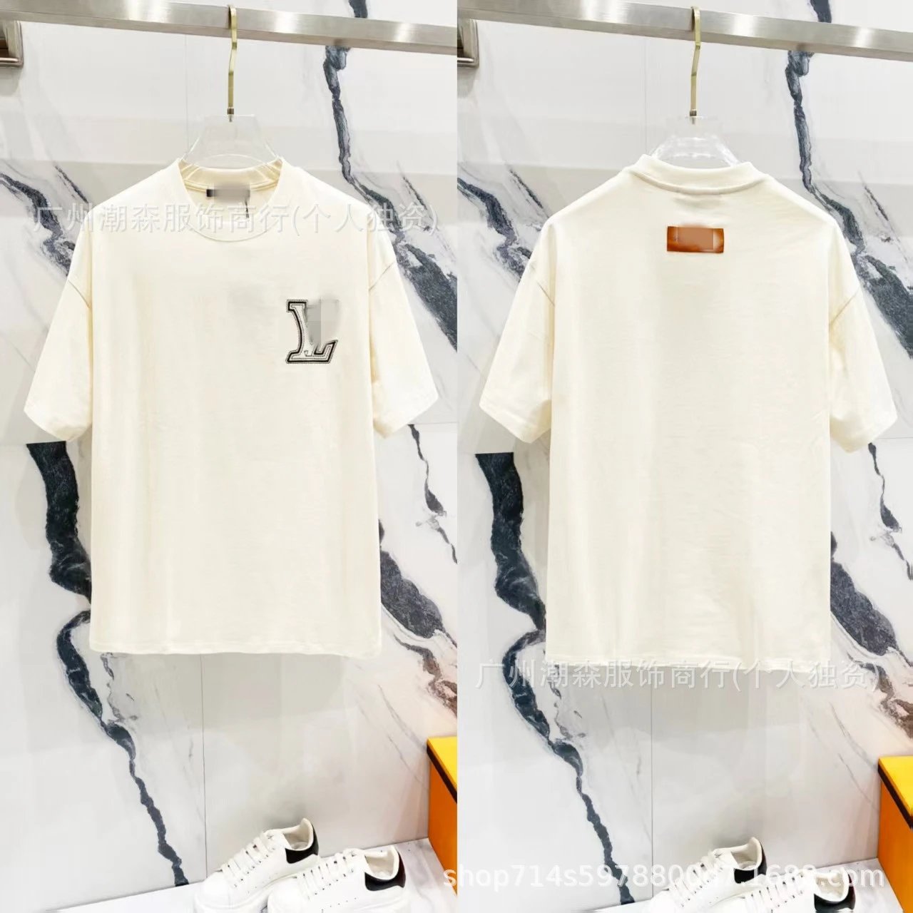 This premium off-white/cream cotton jersey t-shirt features a minimalist yet iconic design with a tonal embroidered 'LV' monogram at the left chest—crafted with black outline and subtle metallic thread detailing for elevated texture. The relaxed-fit silhouette offers comfortable everyday wear, with a classic crew neck and short sleeves cut for modern streetwear styling. A small brown leather patch is discreetly placed at the back neckline, reinforcing authenticity and luxury craftsmanship. Made from soft, breathable cotton fabric with reinforced stitching, it maintains shape wash after wash. Ideal for layering under jackets or wearing solo, this piece bridges high-fashion elegance with casual versatility. Perfect for spring and summer daily wear, weekend outings, or smart-casual events. Pairs effortlessly with white sneakers (as shown), denim, or tailored trousers for a refined contemporary look. The clean aesthetic and signature branding make it a standout staple in any luxury streetwear wardrobe.