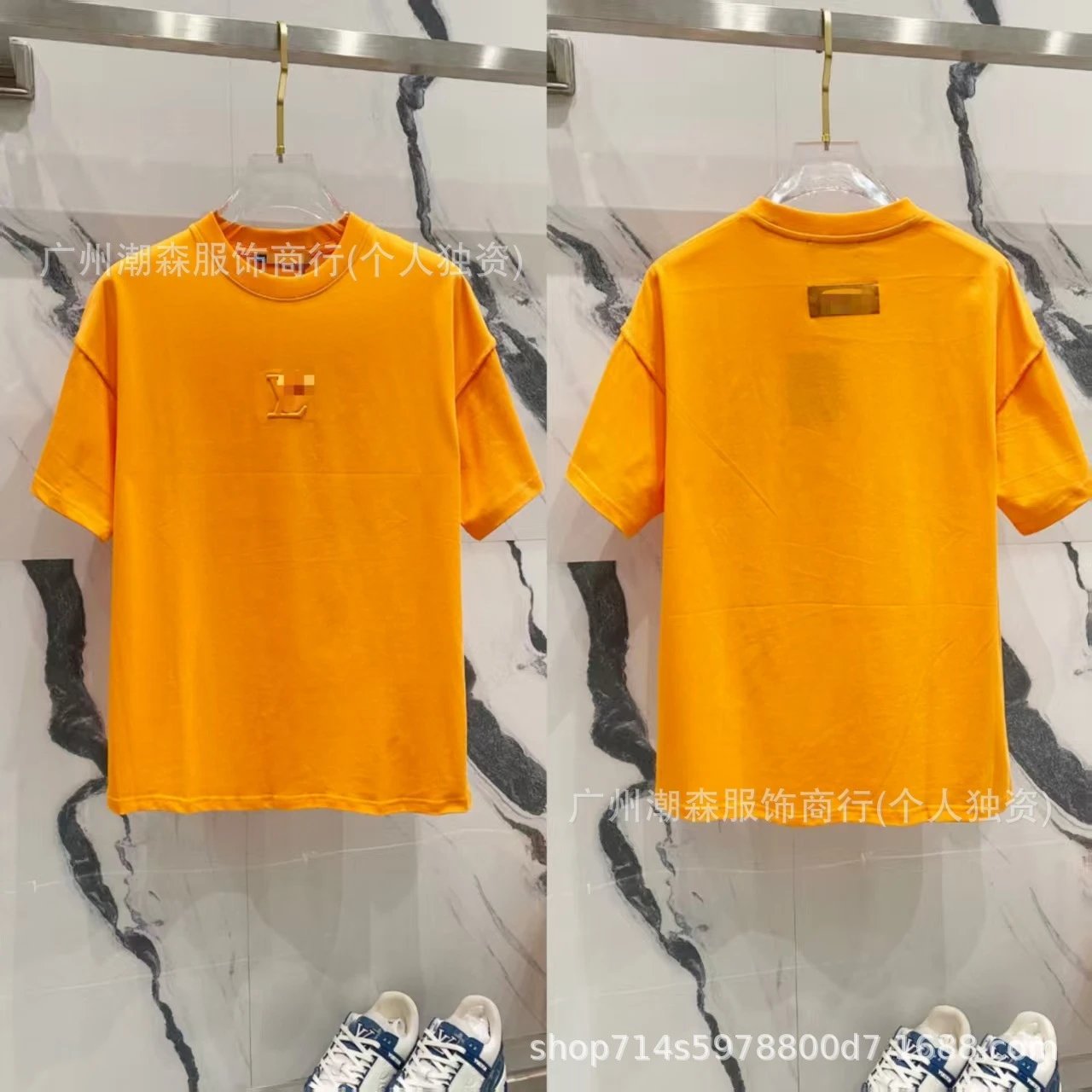 This vibrant orange short-sleeve t-shirt features a minimalist yet luxurious design with a tonal gold-tone embroidered LV logo centered on the chest—crafted in raised, metallic thread for subtle shine and tactile dimension. The back showcases a discreet rectangular gold-tone metal plaque near the neckline, reinforcing brand authenticity and modern streetwear appeal. Made from premium cotton jersey with a relaxed, slightly oversized fit, it offers soft comfort and breathability ideal for warm weather. Clean crew neck, ribbed trim, and clean hemline ensure timeless versatility. Perfect for elevated casual styling: pair with tailored shorts, cargo pants, or denim for urban chic looks. The bold color makes it a standout statement piece while maintaining Louis Vuitton’s signature understated luxury. Ideal for spring and summer daily wear, travel, or social outings where refined streetwear is desired. Note: This appears to be a replica or unauthorized reproduction (evidenced by watermark '广州潮森服饰商行' and non-official tag placement), not an authentic Louis Vuitton product.