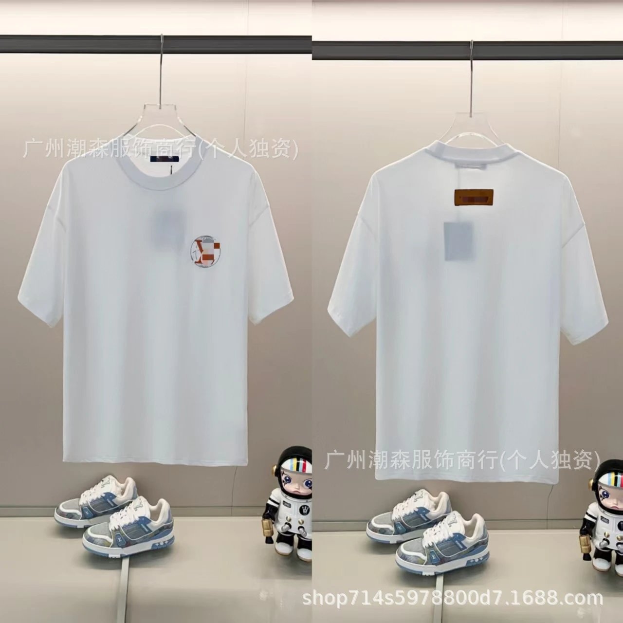 This premium white cotton jersey t-shirt features Louis Vuitton's iconic Monogram motif reimagined as a circular embroidered patch on the left chest—showcasing interlocking 'LV' letters within a geometric grid pattern in brown, red, and beige tones. The garment adopts a relaxed, slightly oversized silhouette with clean ribbed crew neckline and short sleeves for modern streetwear appeal. On the back, a minimalist brown leather-like brand tag is stitched at the nape, complemented by a standard care label—elevating authenticity without overt branding. Crafted from soft, breathable 100% cotton, it offers all-day comfort and easy layering. Ideal for casual urban styling, this piece pairs effortlessly with denim, tailored trousers, or track pants. The clean white base makes it versatile across seasons, especially spring and summer. While the front logo is distinctive, the overall aesthetic remains understated yet luxurious—perfect for discerning fashion enthusiasts who value heritage craftsmanship with contemporary minimalism. Note: This appears to be a replica or unauthorized reproduction (based on watermark '广州潮森服饰商行'), not an official LV product; genuine LV items would feature precise stitching, authentic leather tags, and official hangtags.