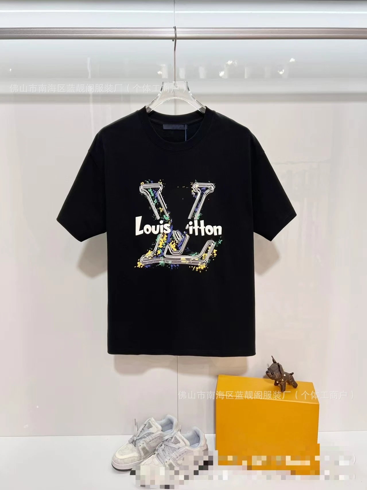 This high-impact streetwear piece features a bold, oversized 'LV' monogram rendered in a dynamic graffiti-inspired aesthetic, with layered white outlines and vibrant splatter accents in yellow, green, blue, and purple—evoking urban artistry and luxury rebellion. The 'Louis Vuitton' text is integrated seamlessly beneath the iconic interlocking letters, all printed on a premium black cotton jersey base for soft drape and comfort. Cut in a relaxed, slightly boxy silhouette with classic crew neck and short sleeves, it offers modern versatility while maintaining elevated craftsmanship. Ideal for layering or standalone wear, this tee bridges high fashion and youth culture—perfect for casual outings, gallery visits, or statement-making street style. Pair with distressed denim, cargo pants, or tailored shorts for an effortlessly chic look. The garment hangs cleanly on a transparent hanger against a minimalist retail backdrop, accompanied by complementary accessories (e.g., designer sneakers and signature yellow box), reinforcing its aspirational positioning. Fabric feels substantial yet breathable, suitable for warm seasons, and the print shows excellent opacity and wash durability.