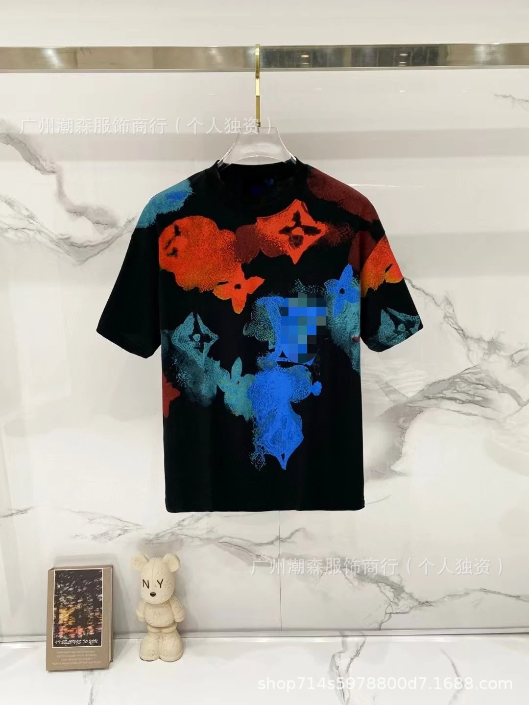 This high-end streetwear t-shirt features Louis Vuitton's iconic Monogram motifs reimagined in a bold, abstract floral print with vibrant orange, cobalt blue, and teal accents against a deep black base. The design employs a painterly, almost graffiti-inspired aesthetic—characteristic of LV’s recent artistic collaborations (e.g., with Takashi Murakami or Virgil Abloh’s tenure)—where the classic LV flower and quatrefoil symbols are deconstructed and layered with expressive brushstroke textures. Crafted from premium cotton jersey, it offers a relaxed, slightly oversized fit ideal for layering or standalone wear. The short sleeves and ribbed crew neckline ensure comfort and versatility. Perfect for fashion-forward individuals seeking luxury street style, this piece bridges haute couture and urban culture. Ideal for casual outings, gallery visits, or styled with tailored trousers for elevated contrast. The garment is displayed on a clear hanger against marble backdrop, emphasizing its art-object quality; a pixelated area suggests sensitive branding protection in retail photography.