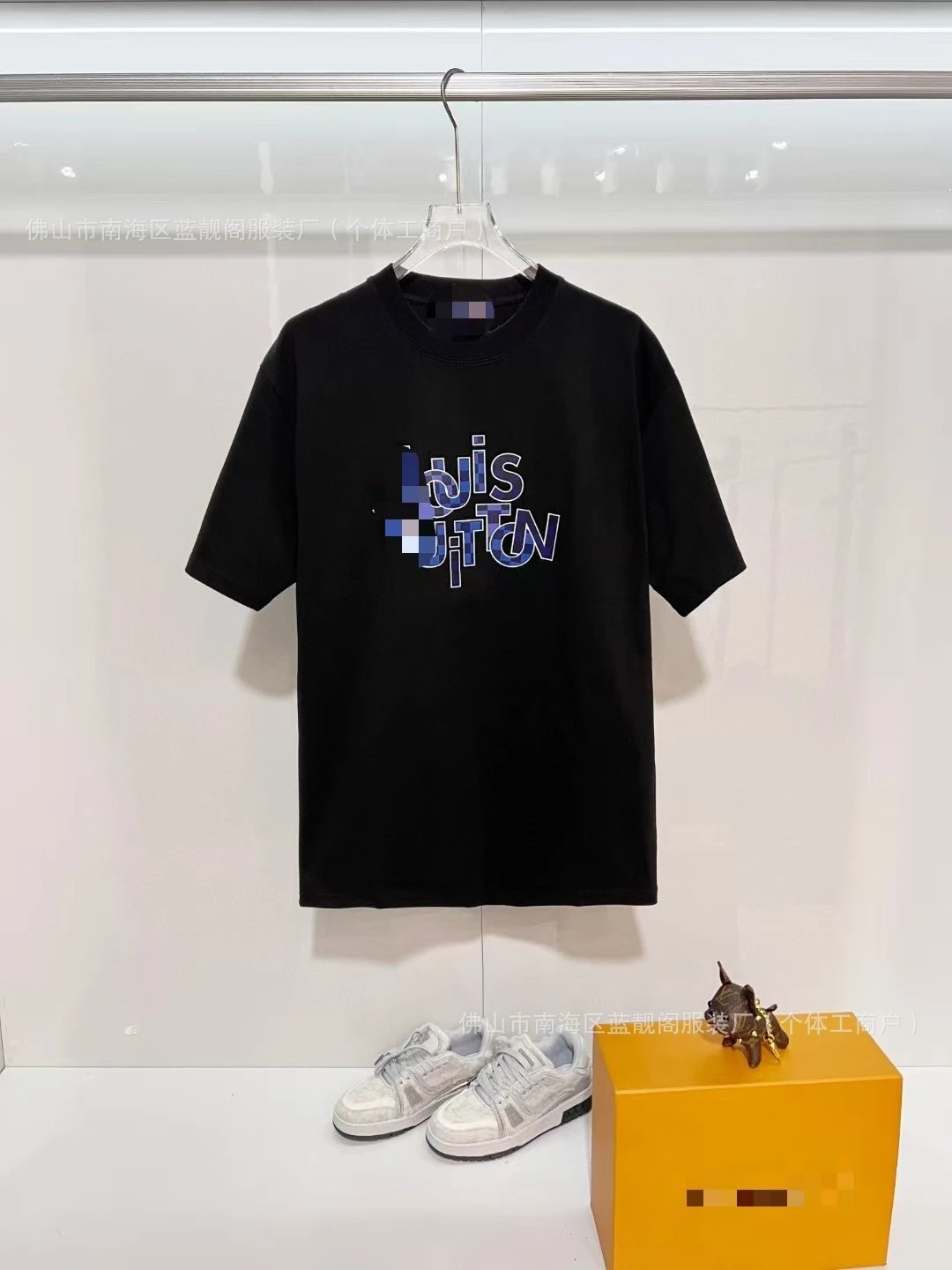 This black short-sleeve crewneck T-shirt features a bold, digitally deconstructed 'LOUIS VUITTON' logo printed centrally on the chest in a pixelated, glitch-art style with layered blue, purple, and white tones. Crafted from premium cotton jersey, it offers a relaxed, slightly oversized fit ideal for contemporary streetwear styling. The graphic design evokes digital nostalgia and high-fashion subversion—signature of LV’s recent collaborations with digital artists and tech-forward collections (e.g., Virgil Abloh’s legacy or Pharrell’s 2024-era direction). The clean neckline and ribbed hem ensure durability and comfort. Paired here with distressed white chunky sneakers and a signature orange box (LV’s iconic Monogram color), it underscores luxury casual dressing. Perfect for urban exploration, gallery visits, or elevated everyday wear in spring/summer. Fabric feels soft yet structured, resisting excessive shrinkage or pilling. Notable detail: the logo’s fragmented geometry creates dynamic visual interest under lighting, enhancing its modern art appeal.