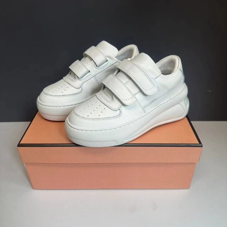 These avant-garde white sneakers showcase Maison Margiela’s signature deconstructed aesthetic with dual wide velcro straps replacing traditional laces, offering effortless adjustability and a bold minimalist silhouette. Crafted from premium smooth leather with precise perforated detailing on the toe cap and clean tonal stitching, they feature a distinctive layered platform sole—thick, sculpted, and subtly asymmetrical—for modern elevation without compromising comfort. The interior lining and padded collar ensure all-day wearability, while the absence of visible branding reinforces the brand’s anti-logo philosophy. Ideal for streetwear-forward ensembles, they pair seamlessly with tailored trousers, wide-leg jeans, or slip dresses for a high-fashion contrast. Perfect for urban exploration, gallery visits, or creative industry settings where conceptual design meets functional ease. The clean white palette ensures versatility across seasons, especially spring and summer, though their architectural form makes them a year-round statement piece in contemporary wardrobes.