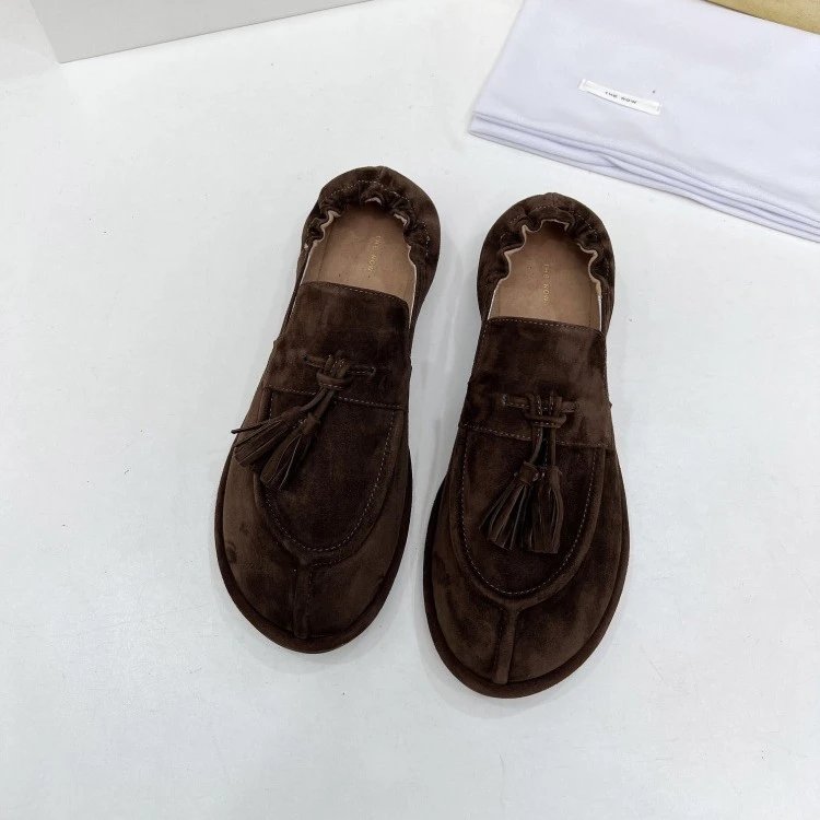 Maison Margiela’s iconic Tabi loafers in rich brown suede feature the brand’s signature split-toe (Tabi) design, inspired by traditional Japanese footwear. The upper is crafted from soft, premium suede with delicate ruched elastic trim at the vamp for a refined, gathered silhouette. A decorative tassel detail adorns the vamp, adding artisanal charm and movement. The interior lining is smooth leather with visible 'MAISON MARGIELA' branding on the insole—subtle yet unmistakable. Flat rubber sole ensures lightweight comfort and all-day wearability. Perfect for avant-garde streetwear, minimalist fashion, or elevated casual styling, these loafers bridge conceptual design with wearable elegance. Ideal for spring and fall seasons, they pair effortlessly with tailored trousers, wide-leg jeans, or midi skirts. Their distinctive silhouette makes a bold statement while maintaining sophistication—true to Maison Margiela’s deconstructed luxury ethos.
