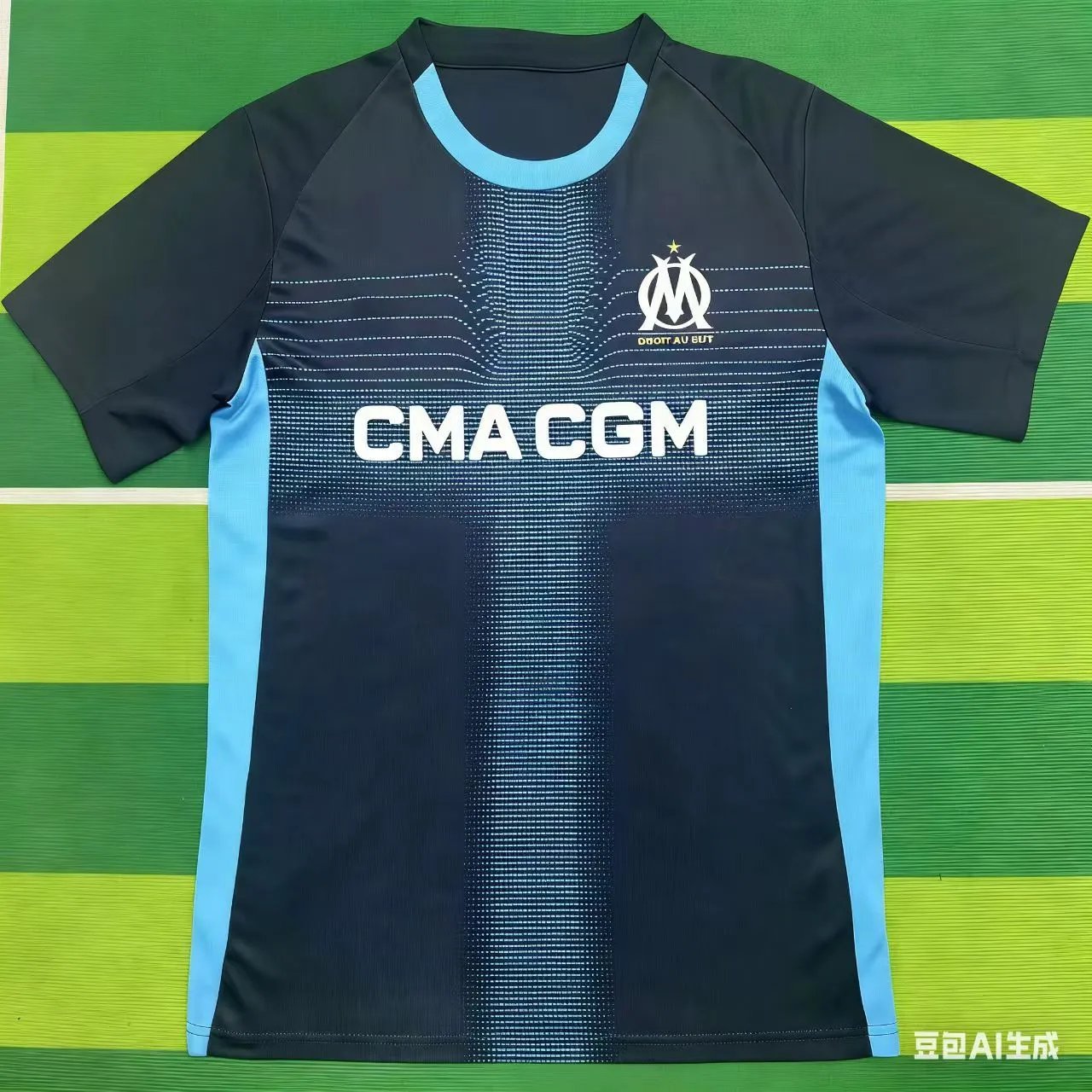 This is the official third jersey of Olympique de Marseille for the 2023–2024 season, designed for performance and fan identity. The jersey features a sleek dark navy/black base with vibrant sky blue side panels and collar trim, creating a modern contrast. A distinctive digital-inspired dot-matrix pattern runs vertically down the chest, evoking motion and tech-forward aesthetics. Centered on the chest is the iconic OM crest—white 'OM' monogram with a star above and the motto 'DROIT AU BUT' (Straight to the Goal) below—symbolizing the club’s ambition and heritage. Prominently displayed across the torso is the main sponsor 'CMACGM' in bold white sans-serif lettering. Constructed from lightweight, moisture-wicking synthetic fabric with raglan sleeves for enhanced mobility, it’s ideal for match days, training, or casual streetwear. The minimalist yet bold design balances sport functionality with contemporary fashion appeal, making it suitable for fans who value both team pride and urban style. Perfect for summer matches or daily wear in warm weather, this jersey embodies Marseille’s coastal energy and competitive spirit.