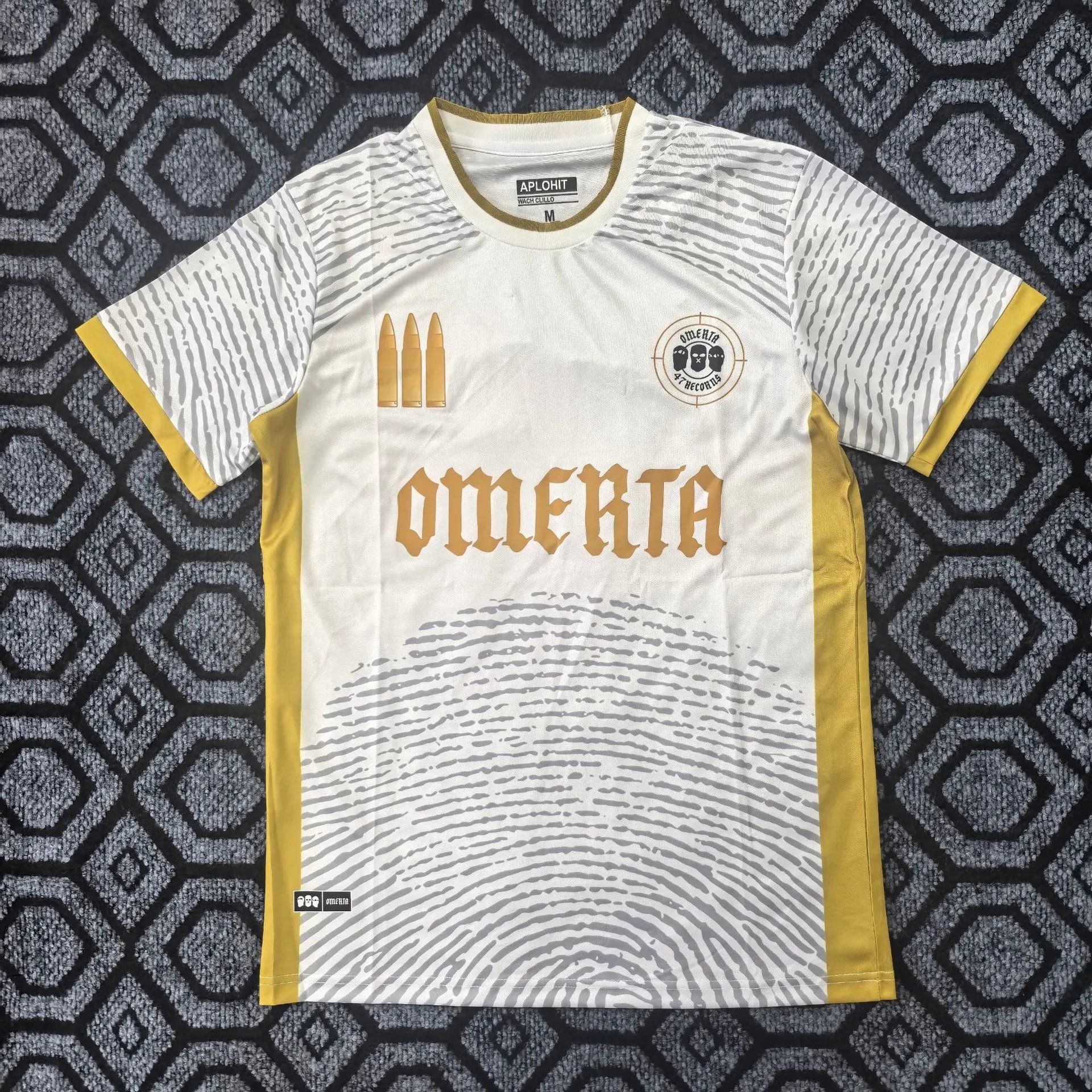 This high-impact streetwear jersey features a bold collaboration between Omerta and Aplohit, blending subcultural symbolism with technical sportswear aesthetics. The front showcases 'OMERTA' in ornate gold Gothic lettering, flanked by three gold bullet motifs on the left chest and a circular emblem with masked figures and '47 Seconds' text on the right—referencing Omerta’s signature themes of silence, resistance, and underground identity. The garment is constructed with a white base and intricate gray fingerprint-like wave patterns radiating from the hem upward, evoking surveillance, identity, and anonymity. Gold trim accents the crew neck, sleeve cuffs, and side panels, adding premium contrast. The inner collar tag reads 'APLOHIT WACH CILLO', confirming the co-designer collaboration. Made from lightweight, breathable performance fabric (likely polyester blend), it offers comfort for daily wear while maintaining a striking visual statement. Ideal for streetwear enthusiasts, collectors of niche urban brands, and fans of dystopian-inspired fashion. Perfect for casual outings, concerts, or layering in transitional seasons. The design balances aggressive iconography with refined tailoring, positioning it as both wearable art and functional apparel.