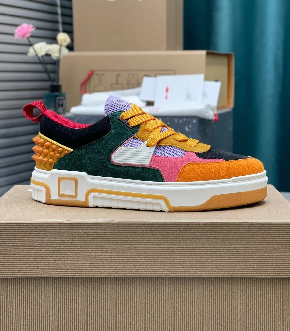 A bold, avant-garde low-top sneaker featuring Philipp Plein’s signature spiked heel detail and futuristic chunky sole. The upper combines premium suede in deep forest green, vibrant pink, tangerine orange, and black panels, accented with lavender mesh overlays and a distinctive white geometric side stripe. Bright yellow laces and a contrasting red pull tab at the heel add playful energy, while the sculpted white midsole with gold-tone accents and integrated square window detail reinforces the brand’s maximalist luxury aesthetic. The outsole features a gum rubber tread for traction and visual warmth. Designed for high-impact streetwear expression, this sneaker balances edgy design with everyday wearability—ideal for fashion-forward individuals seeking statement footwear. Perfect for urban exploration, gallery visits, or night-out styling, it pairs effortlessly with denim, cargo pants, or tailored shorts. Seasonally versatile across Spring, Summer, and Fall, the breathable mesh elements ensure comfort in mild to warm conditions. Though visually complex, the construction maintains structural integrity with reinforced stitching and cushioned insole for moderate all-day support.