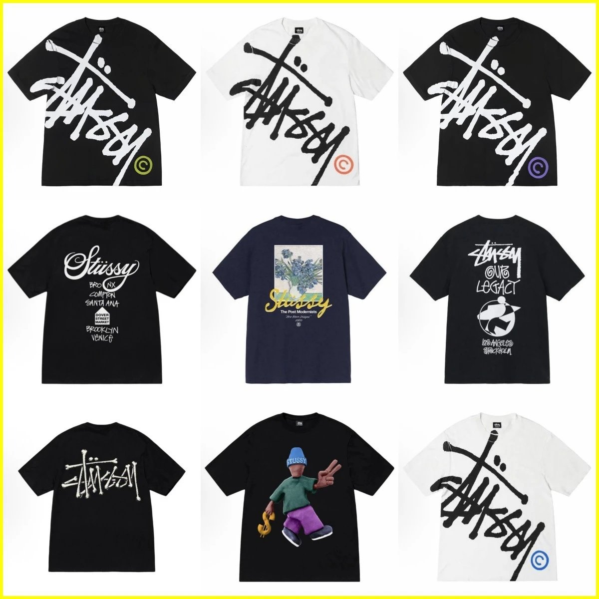 A curated collection of Stüssy's iconic streetwear T-shirts featuring bold graffiti-style logo prints, artistic collaborations, and signature typography. Key highlights include the classic crossed-paintbrush 'Stüssy' script in high-contrast black/white, city-themed back prints listing global locations (Brooklyn, Venice, etc.), a Van Gogh-inspired floral graphic with 'The Post Modernists' text, and a playful 3D animated character holding a dollar sign. Each tee uses premium cotton jersey for soft comfort and durability, with screen-printed graphics that resist fading. The designs blend skate culture heritage with contemporary art references, making them ideal for urban street style. Perfect for layering or solo wear in warm weather, these tees suit casual outings, concerts, gallery visits, or everyday fashion-forward looks. Neck tags feature the Stüssy crown logo, confirming authenticity. Multiple colorways—including solid black, white, navy, and multicolor accents—offer versatility across seasons.